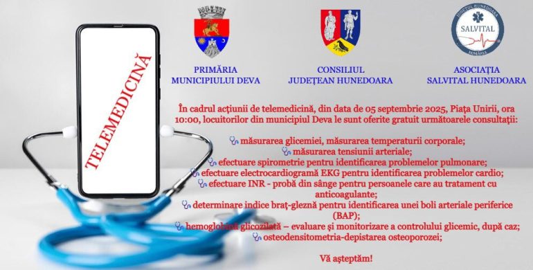 Primăria Municipiului Deva susține Caravana SALVITAL, un proiect dedicat evaluării gratuite a stării de sănătate a populației, prin telemedicină și teleconsultații, cu ajutorul celor mai noi tehnologii din domeniul medical.
