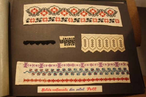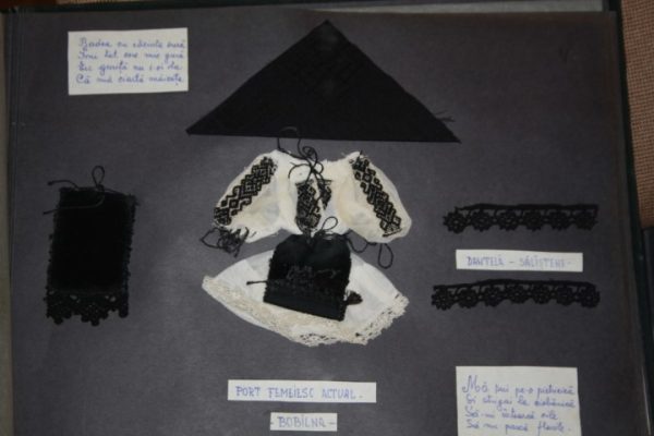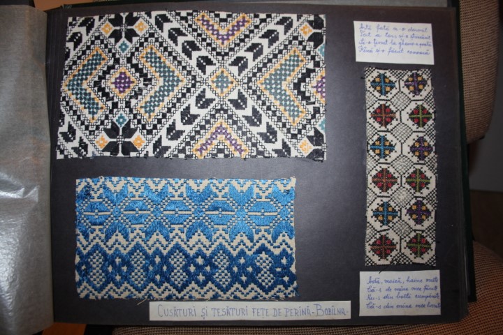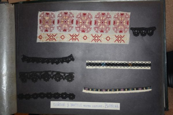 Apare şi o mostră cu „hurculaşi”, broderii ajurate cu firele scoase din ţesătură, uneori cumpărate din comerţ şi care împodobeau cămaşa. Mai mult, între paginile albumului găseşti şi trei mini costume ţărăneşti ingenios prezentate din Boiu şi Bobâlna.