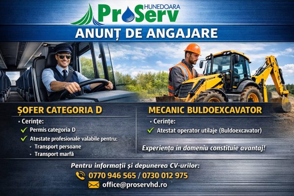 SC PROSERV SA angajează șofer categoria D și mecanic buldoexcavator