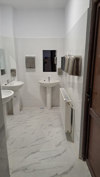 În grupurile sanitare au fost montate deja lavoarele, bateriile, uscătoarele de mâini cu senzori, dozatoare de săpun, vase de toaletă, pisoare iar pe holuri fântâni cu apă potabilă.