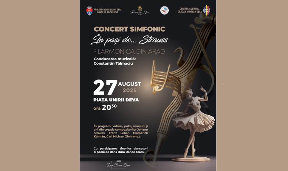 Pe 27 august 2025, de la ora 20:30, Piața Unirii din Deva se va transforma într-o scenă elegantă a muzicii clasice, găzduind concertul simfonic extraordinar „În pași de… Strauss”, organizat de Primăria Municipiului Deva prin Centrul Cultural „Drăgan Muntean”.