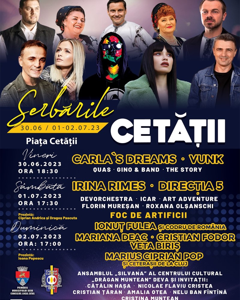 În perioada 30 iunie – 2 iulie 2023, pe scena care va fi amplasată în Piața Cetății vor urca Carla`s Dreams, Vunk, Direcția 5, Irina Rimes dar și alți artiști talentați.
