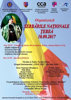 Duminică, 10 septembrie 2017, Centrul de Cultură și Artă al județului Hunedoara vă invită să participați la Serbările Naționale Țebea, manifestări comemorative prilejuite anul acesta la împlinirea a 145 de ani de la moartea lui Avram Iancu, supranumit și „Crăișorul Munților”.