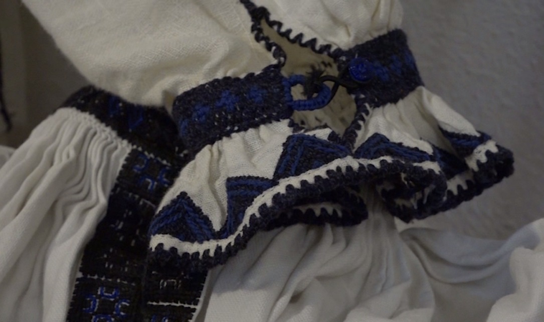 Monica îi arată Ioanei modelul la care muncește, apoi îl compară cu cel al cămeșei pe care o poartă la șezătoarea din Postul Crăciunului: „Uite, pânza asta la care eu cos acum, este de 16 fire, este de cânepă cu in, dar cea pe care eu o port are 50 de fire pe centimetru pătrat. Vă daţi seama cum coseau bunicile noastre la lampă, că nu aveau curent electric, după ce terminau lucrul în gospodărie, cu vitele, cu mâncarea, toate treburile casei. Noi avem acum curent, lupe și toate condiţiile şi tot nu facem ce reușeau ele veacul trecut”. Monica poartă o ie veche adusă din satul bunicii: „Ea era din Dobra de Sus, din județul Alba, foarte aproape de Mărginimea Sibiului, motiv pentru care cămașa are o mare influenţă din zonă.”