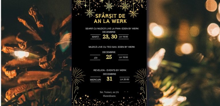Seria evenimentelor se încheie miercuri, 31 decembrie, cu Revelionul organizat la Events by Werk, începând cu ora 20:00. Petrecerea de final de an promite un cadru elegant și o atmosferă potrivită pentru întâmpinarea noului an într-un mod special.
