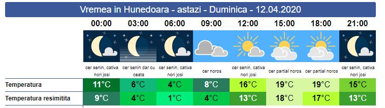 Duminică, vremea se menține caldă, cu unele înnorări. Soarele răsare la ora 06:45. În prima parte a zilei, va fi rece. Meteorologii anunță că pe arii extinse, în zona noastră, se vor înregistra înnorări, apoi treptat cerul va deveni variabil. Vântul va avea și unele intensificări, la fel ca în ziua precedentă. Soarele va apune la ora 20:12. Temperaturile maxime se vor încadra între valorile 16 și 19 grade, iar cele minime între 4 și 8 grade.