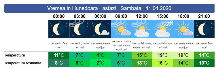 Weekend-ul, începe cu temperaturi mai scăzute față de zile trecute, doar câțiva nori trecători vor acoperi cerul însorit. Sâmbătă, soarele răsare la ora 06:47. Nu vom scăpa de vânt care va sufla de la slab la moderat cu unele intensificări, iar valorile termice se vor încadra în limite normale perntru această dată. Soarele apune la ora 20:15. Minima zilei va fi cuprinsă între valorile de 4-7 grade, iar maxima se va situa în jurul valorii de 19 grade, dar se va resimți mai rece.