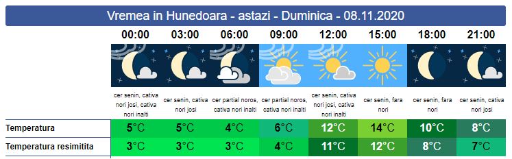Duminică, va fi vreme frumoasă, dar după ce se va ridica ceața. Soarele răsare la ora 07:17. Dimineață, în zona noastră vom resimți temperaturi mai scăzute față cele din termometre. Ceața va fi prezentă în zonele joase, iar în zonele de deal și munte cerul va fi senin cu temperaturi chiar mai ridicate. În jurul amiezii, soarele va încălzi atmosfera și cerul se va însenina. Soarele apune la ora 17:06. Valorile minime se vor înregistra între 3 și 5 grade iar cele maxime vor ajunge spre 14 grade.