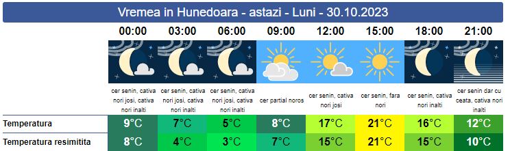 Luni, cerul va fi variabil spre senin, cu temperaturi prietenoase. Vântul va sufla slab și moderat, cu unele intensificări pe timpul nopții, iar ceața va fi prezentă în zonele joase, atât în prima parte a zilei cât și peste noapte. În zona noastră, valorile maxime se vor încadra în jurul valorii de 21 de grade.