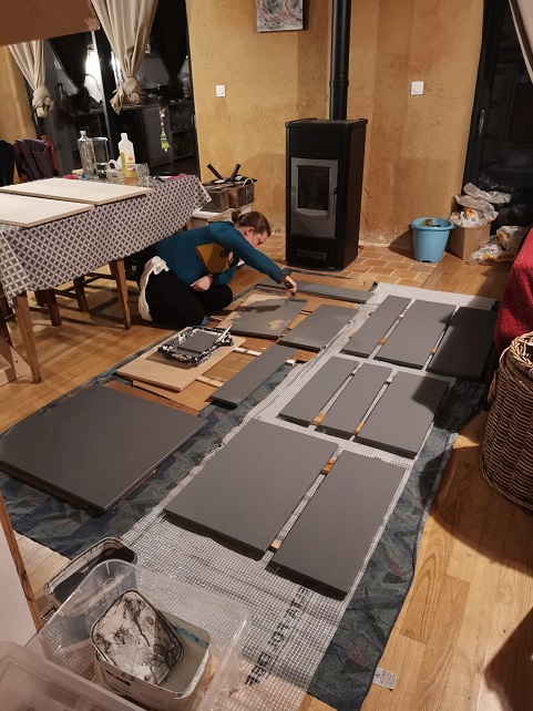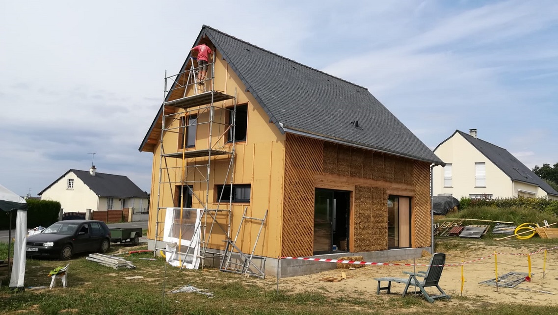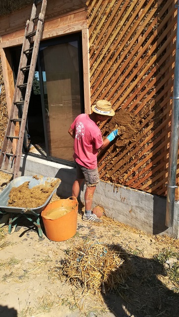 Noi am construit o structură din lemn cu distanță între panouri egală cu dimensiunea unui balot de paie. Deci, după ce structura a fost construită, am introdus baloții de paie între panouri și apoi i-am tencuit cu argila. Tencuiala se face bătrânește cu mâna și suprafețele nu sunt „perfecte”, dar au un aspect frumos. Avantajul argilei în fața unei tencuieli pe baza de ciment este că argila se adaptează în continu. La umezeală absoarbe umezeala și pe timp uscat eliberează umezeala. Acest lucru este un avantaj major, nu o sa vezi niciodată igrasie și mediul este foarte sănătos.