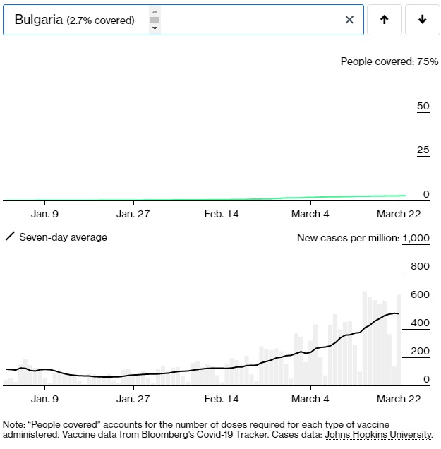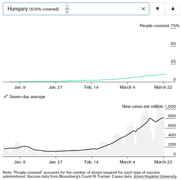 (În fiecare grafic, în partea de sus este evoluția vaccinării, iar în partea de jos evoluția cazurilor raportate la un milion de locuitori)
