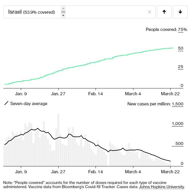 Vă vom prezenta câteva grafice de analiză în care se vede scăderea numărului de cazuri raportate în paralel cu creșterea numărului de persoane vaccinate în cazul țărilor din prima linie a vaccinării și, din nefericire, creșterea numărului de cazuri în țări mai „relaxate” și mai „opintite” în relația cu pandemia de COVID-19.