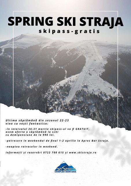„Avem onoarea și plăcerea de a te invita în săptămâna altfel la Straja. Skipass gratuit în perioada 26-31 cu oferta o săptămână la schi, la doar 990 de lei de persoană, petrecere de final de sezon la Apres Bar – Straja în weekendul 1-2 aprilie, noaptea ratracelor în același weekend. A mai rămas foarte puțin din acest sezon așa că hai să profităm la maximum de zilele rămase, noi venim cu zăpadă, voia bună, distracția și cazarea, iar tu nu trebuie să ratezi noaptea celor 9 ratrace și nici turele cu acestea. Tot pe această cale vrem să le mulțumim tuturor și fiecăruia în parte, pentru ca ați adus culoare pe pârtiile noastre, pe care ne-am străduit să le ținem în cele mai bune condiții în acest sezon atipic. Vă mulțumim pentru încrederea acordată!”, informează reprezentanții Complexului Montana din Straja.