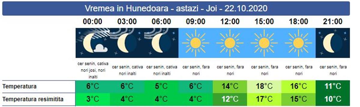 Joi, vom avea parte de o zi minunată de octombrie cu temperaturi în creștere. Soarele răsare la ora 07:53. Dimineața va rămâne în continuare rece și pe alocuri e posibil ca ceața și bruma să fie prezentă, îndeosebi în zonele depresionare. Din a doua parte a dimineții și până spre seară atmosfera se va încălzi treptat, iar atmosfera va deveni plăcută. Soarele apune la ora 18:31. Temperaturile minime se vor situa între 4 și 6 grade, în timp ce temperatura maximă vor urca spre 18 grade.