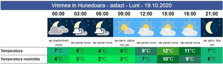 Luni, vremea va fi răcoroasă și cu înnorări temporare. Soarele răsare la ora 7:49. Dimineața temperaturile se vor situa sub media anuală, iar pe alocuri se va produce bruma și ceața. Vântul va sufla slab spre moderat, doar pe creste vântul va avea unele intensificări. Pe tot parcursul zilei cerul va fi variabil. Soarele apune la ora 18:36. Temperaturile minime se vor situa între 4 și 7 grade, iar maxima zilei va urca până la 12 grade.
