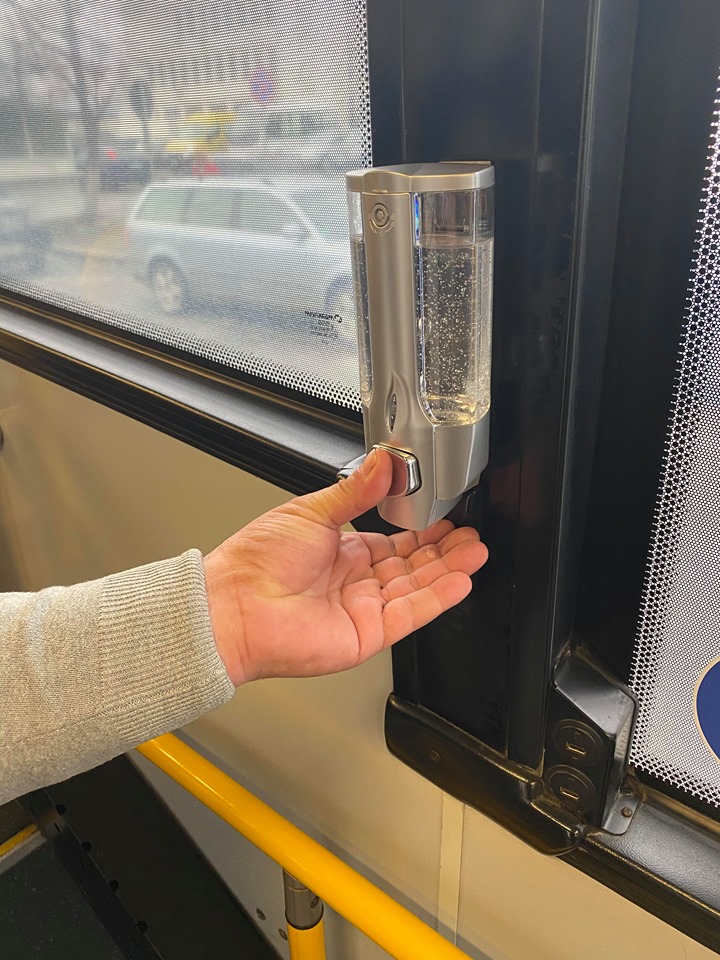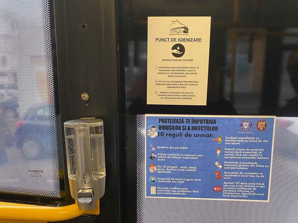Călătorii sunt rugaţi să folosească soluţia dezinfectantă din dispensere la urcarea în mijlocul de transport local precum şi la coborâre.