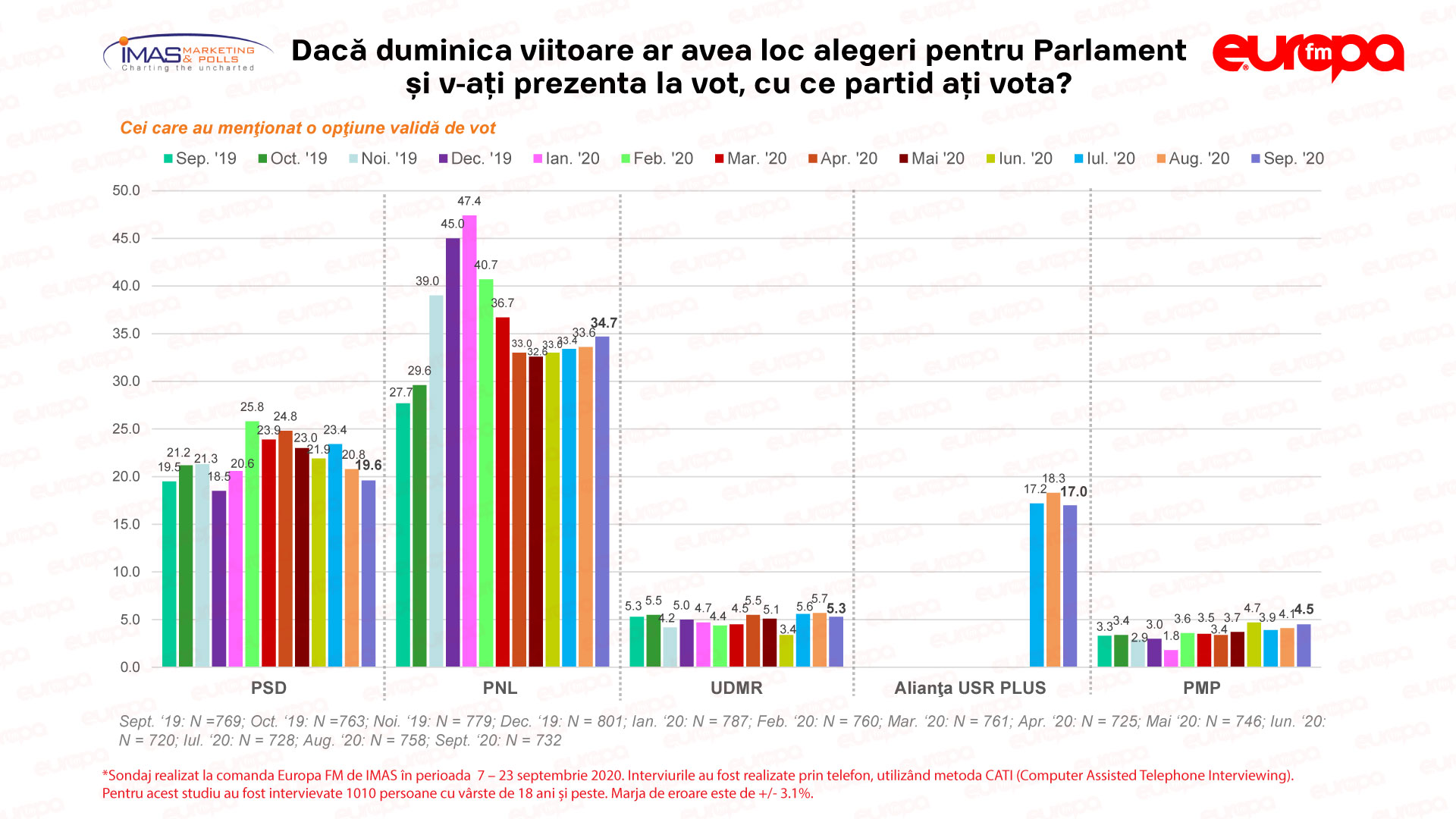 Sondajul a fost realizat de IMAS, la comanda Europa FM, în perioada 7 – 23 septembrie pe un eşantion de 1010 persoane şi are o marjă de eroare de 3,1%.