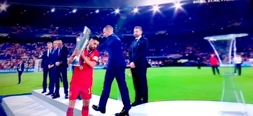 La Rotterdam, pe stadionul De Kuip, prima repriză din finala Ligii Naţiunilor, dintre Spania şi Croaţia, a fost una fără goluri. Echipa antrenată de Luis de la Fuente a avut posesia mai bună, dar o singură ocazie clară la poarta lui Livakovic – şutul lui Gavi, din minutul 12. Croaţia a stat bine în defensivă şi nu a insistat în atac, doar Perisic dându-i ceva emoţii portarului Unai Simon. Nici repriza secundă nu a excelat în faze periculoase de poartă, cu excepţia ratării lui Ansu Fati, din minutul 84. Atunci Ansu Fati a primit în careu, de la Merino, a şutat, dar Perisic a scos din faţa porţii. Primele 90 de minute s-au încheiat fără gol marcat şi s-a intrat în cele două reprize de prelungiri. Dani Olmo a trimis peste poartă în minutul 103 şi cum tabela nu s-a schimbat, după 120 de minute s-a trecut la lovituri de departajare. Aici Unai Simon a respins şuturile lui Lovro Majer şi Bruno Petkovic, iar Dani Carvajal a transformat lovitura decisivă aducând titlul Spaniei, care câştigă astfel Liga Naţiunilor.