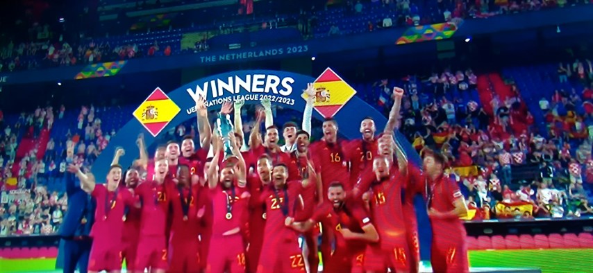 La Rotterdam, pe stadionul De Kuip, prima repriză din finala Ligii Naţiunilor, dintre Spania şi Croaţia, a fost una fără goluri. Echipa antrenată de Luis de la Fuente a avut posesia mai bună, dar o singură ocazie clară la poarta lui Livakovic – şutul lui Gavi, din minutul 12. Croaţia a stat bine în defensivă şi nu a insistat în atac, doar Perisic dându-i ceva emoţii portarului Unai Simon. Nici repriza secundă nu a excelat în faze periculoase de poartă, cu excepţia ratării lui Ansu Fati, din minutul 84. Atunci Ansu Fati a primit în careu, de la Merino, a şutat, dar Perisic a scos din faţa porţii. Primele 90 de minute s-au încheiat fără gol marcat şi s-a intrat în cele două reprize de prelungiri. Dani Olmo a trimis peste poartă în minutul 103 şi cum tabela nu s-a schimbat, după 120 de minute s-a trecut la lovituri de departajare. Aici Unai Simon a respins şuturile lui Lovro Majer şi Bruno Petkovic, iar Dani Carvajal a transformat lovitura decisivă aducând titlul Spaniei, care câştigă astfel Liga Naţiunilor.