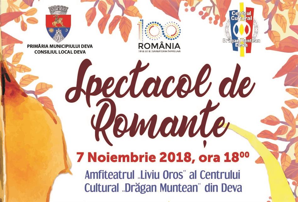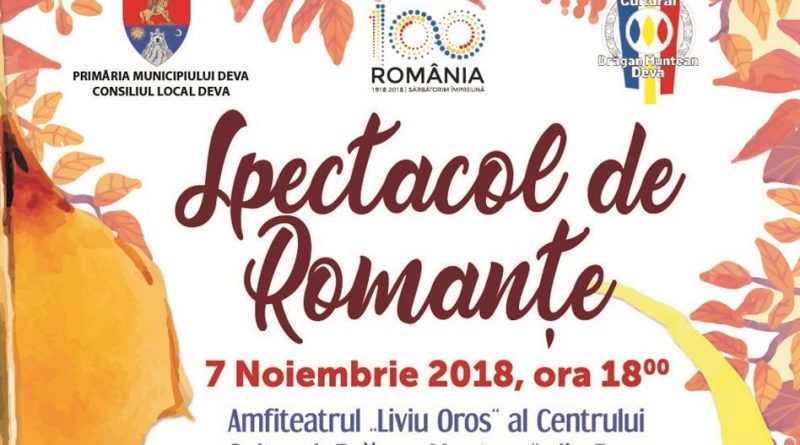 Primăria Municipiului Deva vă invită, miercuri, 7 noiembrie 2018, la ora 18:00, în Amfiteatrul „Liviu Oros” al Centrului Cultural „Drăgan Muntean” Deva, la un spectacol extraordinar de romanţe, susţinut de soliştii Vasile Repede, Lorena Pascu, Mariana Risipitu, Eugen Pistol şi Ana Almăşana-Ciontea. Acompaniamentul este asigurat de grupul instrumental condus de prof. George Cîlţea.