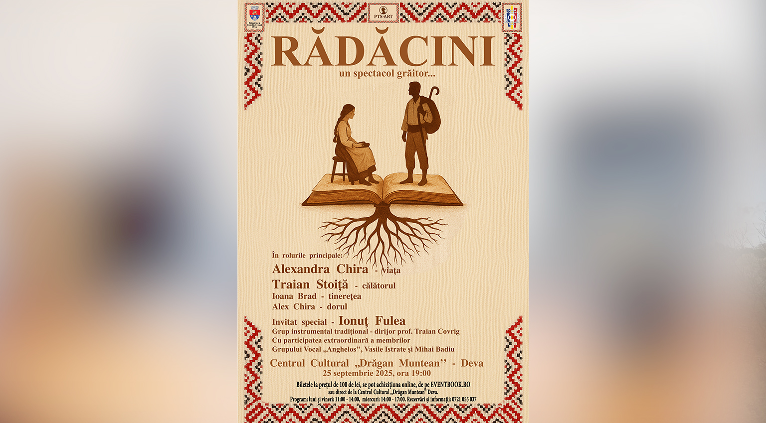 Primăria Municipiului Deva și Centrul Cultural „Drăgan Muntean” vă invită să trăiți o experiență culturală profundă: „RĂDĂCINI”, un spectacol care împletește autenticitatea folclorului românesc cu simbolismul teatral și reflecția filozofică. Evenimentul va avea loc joi, 25 septembrie 2025, de la ora 19:00, în sala mare a Centrului Cultural.