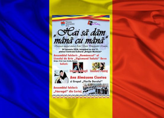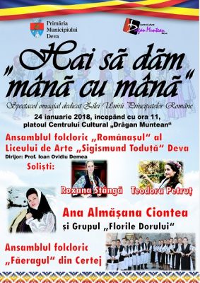 Primăria Municipiului Deva și Centrul Cultural ”Drăgan Muntean” vă invită, miercuri, 24 ianuarie 2018, la ora 11:00, în Piața Victoriei, la spectacolul ”Hai să dăm mână cu mână”, dedicat aniversării a 159 de ani de la Unirea Principatelor Române.
