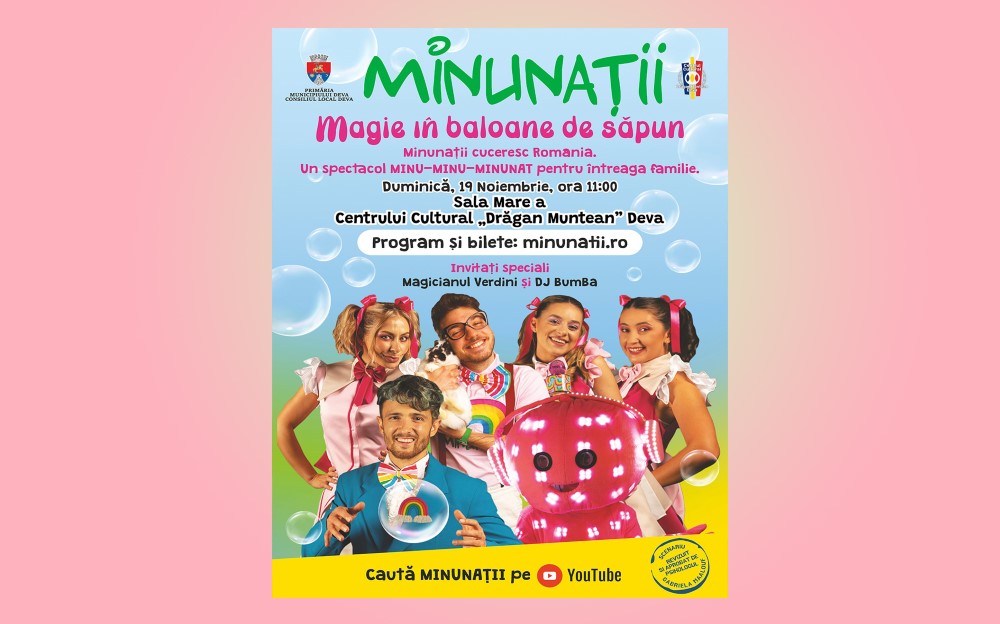Primăria Municipiului Deva și Centrul Cultural „Drăgan Muntean” Deva vă invită duminică, 19 noiembrie, ora 11:00, la Centrul Cultural ,,Drăgan Muntean”, unde, Minunații lui Verdini prezintă spectacolul pentru copii „Magie în baloane de săpun” .