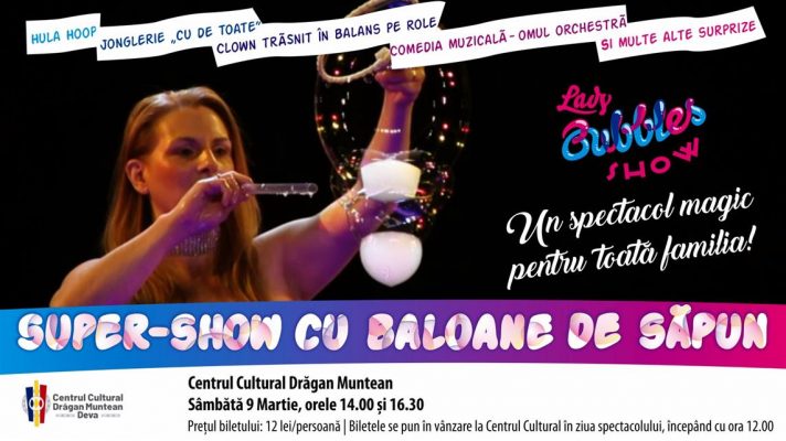 Centrul Cultural „Drăgan Muntean” Deva vă invită, sâmbătă, 9 martie 2019, de la orele 14:00 şi 16:30, în sala mare, la un super-show cu baloane de săpun, susţinut de Corina şi Grigo Grigorescu.