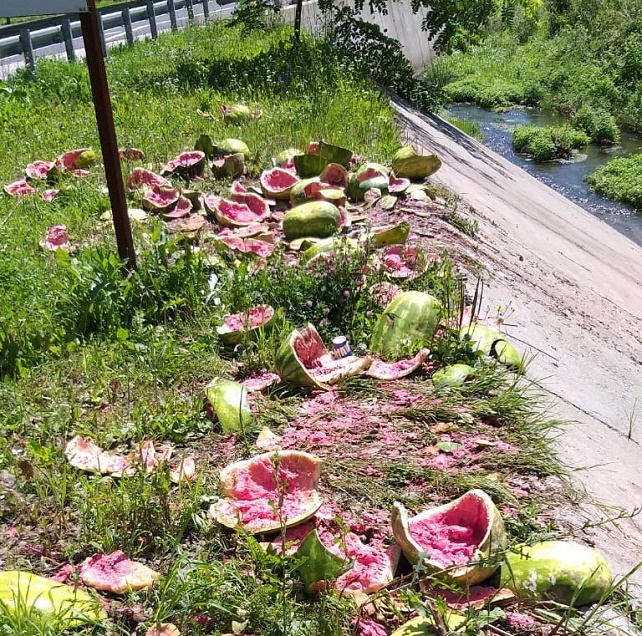 Sute de pepeni au ajuns pe malul apei de pe drumul național 76, în zona Fornădia din comuna Șoimuș. Pepenii au căzut dintr-un vehicul, iar acum angajații Drumurilor Naționale vor curăța zona.