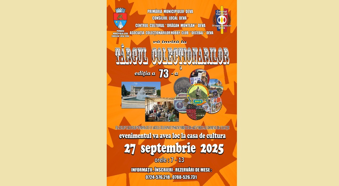 Primăria Municipiului Deva și Centrul Cultural „Drăgan Muntean” vă invită la Târgul Colecționarilor – ediția a 73-a, un eveniment cu tradiție, dedicat pasionaților de frumos, istorie și obiecte rare.
