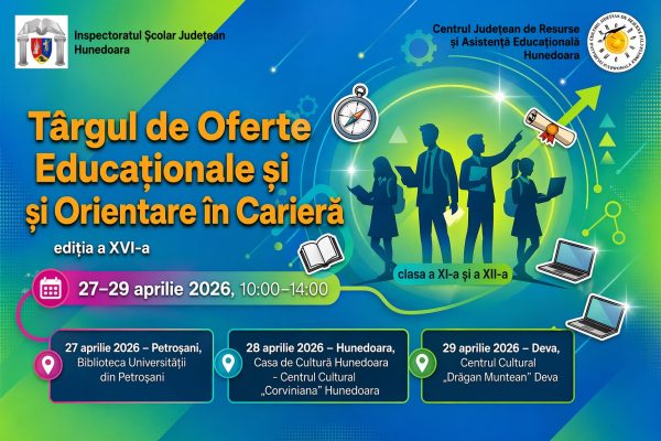 Inspectoratul Școlar Județean Hunedoara, în parteneriat cu Centrul Județean de Resurse și Asistență Educațională Hunedoara, organizează în perioada 27–29 aprilie 2026, Târgul de Oferte Educaționale și Orientare în Carieră.