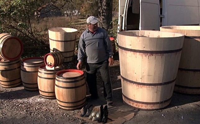 Un tânăr vinde putini şi butoaie din lemn făcute chiar de el. Cornel Cioara a învăţat de la tatăl şi bunicul său dogărie şi este unul din puţinii tineri din sate care duce mai departe tradiţia familiei.