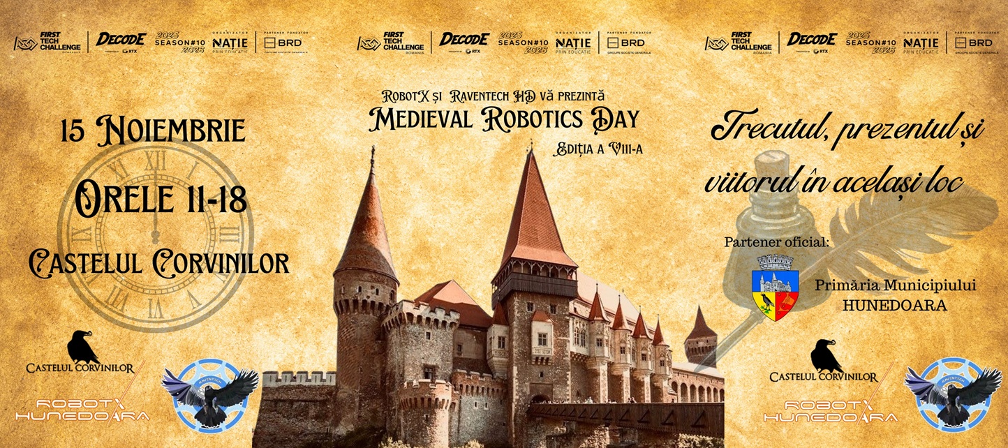 Castelul Corvinilor din Hunedoara va găzdui, pe 15 noiembrie 2025, cea de-a VIII-a ediție a Medieval Robotics Day, un eveniment unde trecutul se întâlnește cu viitorul. Organizată de RobotX și RavenTech HD, manifestarea aduce din nou în prim-plan pasiunea tinerilor pentru știință, tehnologie și colaborare.