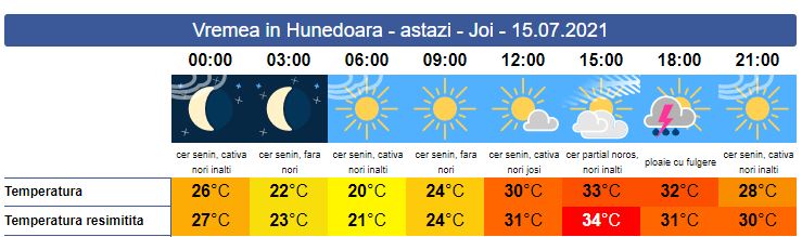 Joi, disconfortul termic va fi accentuat. Soarele răsare la ora 05:51. Până spre amiază cerul va fi senin, apoi meteorologii anunță o ușoară instabilitate începând cu a doua parte a zilei. Cerul se va înnora, iar local posibil să cadă averse însoțite de descărcări electrice. Vântul va sufla slab spre moderat, cu unele intensificări în zonele înalte. Soarele va apune la ora 21:17. Valorile minime se vor înregistra între 20-22 de grade, iar maximele se vor resimți în jurul valorii de 34 de grade.