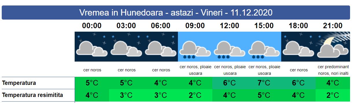 Vineri, se anunță vreme închisă. Soarele răsare la ora 07:58. Temperaturile se vor situa peste normalul perioadei, iar peste zi se vor înregistra ploi pe arii extinse. În zonele de deal precipitațiile vor fi mixte, iar pe creste va continua să ningă. Vântul va avea unele intensificări mai ales în zona montană. Soarele va apune la ora 16:45. Valorile termice se vor situa între 5 și 7 grade.
