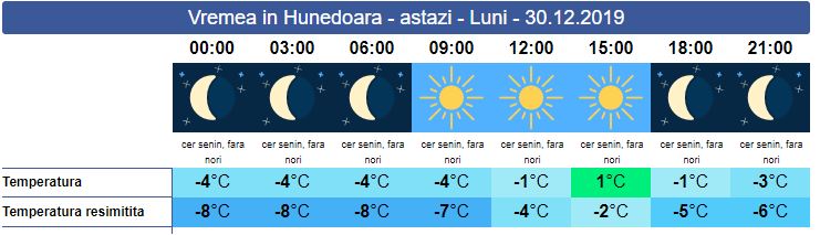 Ziua de luni ne va surprinde cu vreme frumoasă, dar rece. În zona noastră cerul va fi senin fără nici o pată de nori, iar soarele va strălucii pe toată perioada zilei. Dimineața, în zonele joase se va forma ceața asociată de chiciură. Temperaturile nu vor urca mai mult de 1 grad în termometre.