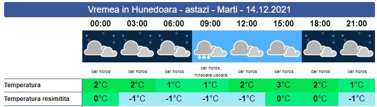 Marți, atmosfera se menține închisă. Soarele răsare la ora 07:59. Pe alocuri va fulgui, iar la munte se vor înregistra ninsori ușoare. Vântul va sufla slab spre moderat. Soarele va apune la ora 16:46. Temperaturile se vor situa în jurul valorii de 2 grade