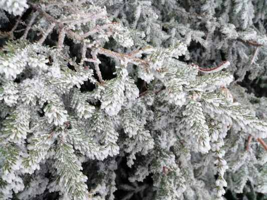 Bruma dimineții se depune peste totul, acoperind pajiștile și copacii cu un strat subțire de gheață, și lăsând în urma sa o aură mistică.