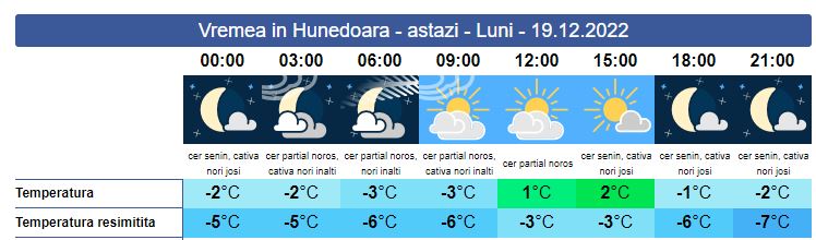Luni, atmosfera va fi plăcută. Soarele răsare la ora 08:03. Pe timpul nopții valorile termice vor fi negative, iar pe timpul zilei vor urca doar câteva grade peste zero. Cerul se va însenina treptat, dar posibil ca în unele zone să se lase ceața. La munte e frig, senin în prima partea a zilei, apoi va fi ceață sau norii joși. Vântul va sufla slab și moderat, mai activ în zonele înalte. Soarele va apune la ora 16:47. Maxima zilei se va situa în jur de 2 grade, iar minima în jur de -3 grade.