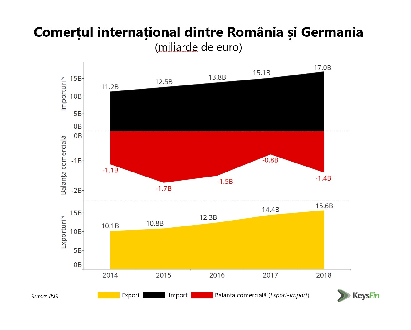 Potrivit analizei realizate de experții KeysFin, Germania își menține statutul de prim partener comercial, fiind totodată și principala țintă a exporturilor României, înregistrând, în ultimii cinci ani, un avans de peste 54%, ajungând la suma totală de 15,6 miliarde de euro în 2018. De asemenea, potrivit datelor Institutului Național de Statistică, valoarea schimburilor comerciale dintre cele două țări a crescut în 2018 cu 52% față de 2014 și cu 10% față de 2017, ajungând la peste 32,5 miliarde de euro.