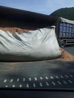 Traficul pe DN 66, în zona Peșterii Bolii, se desfășoară cu dificultate. Încărcătura unui camion s-a răsturnat pe șosea, îngreunând astfel traficul rutier în zonă.