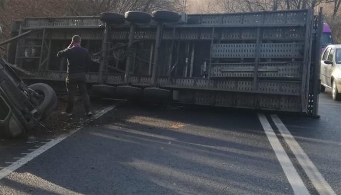 Trafic restricționat pe DN66. Un tir s-a răsturnat blocând circulația rutieră