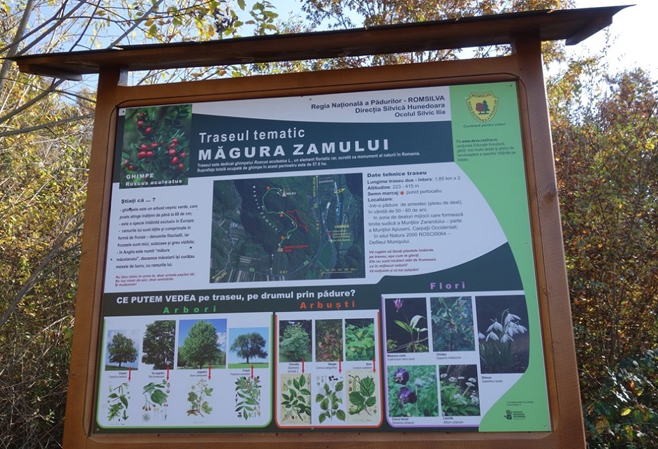 “Aici veţi întâlni ghimpele (Ruscus aculeatus) – o specie europeană rară, un arbust veşnic verde cu ramurile transformate în frunze şi cu fructe decorative, asemănătoare cireşelor. Traseul „Măgura Zamului”, cu lungimea de 3.7 km (dus-întors) este marcat şi dotat cu un panou informativ”, arată cei de la Romsilva Hunedoara.