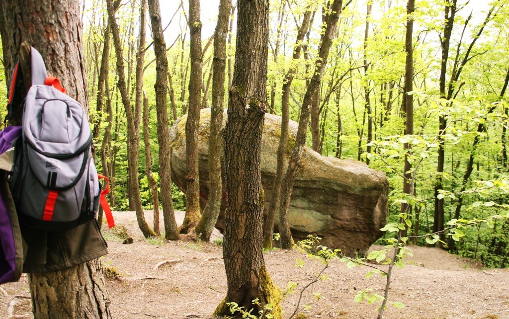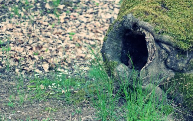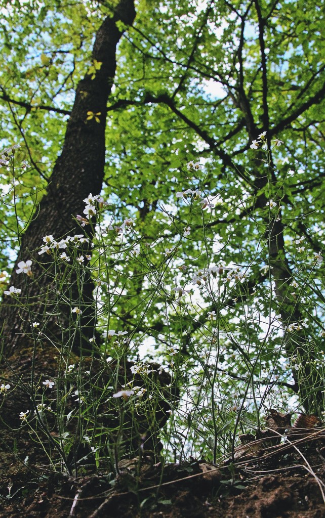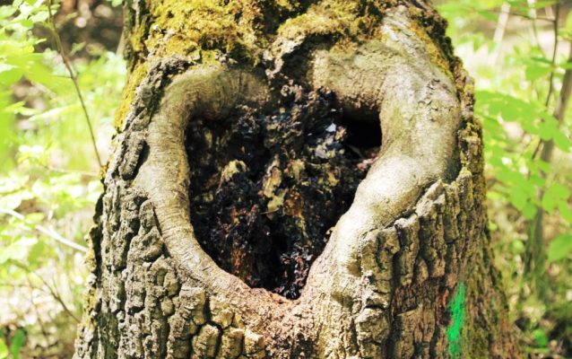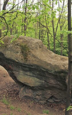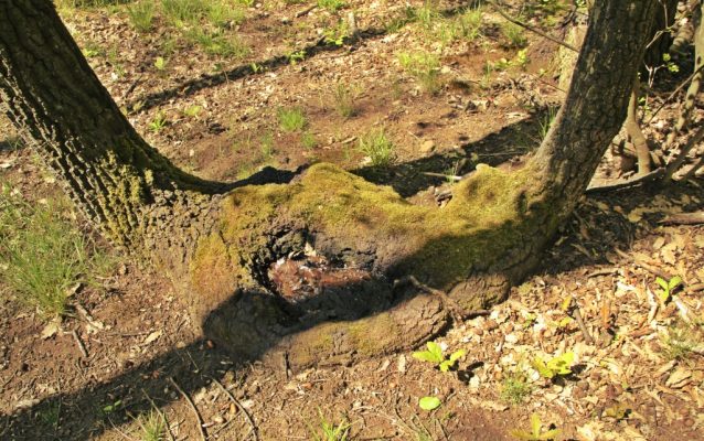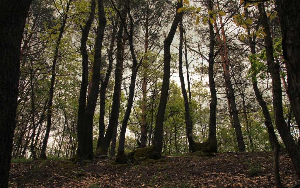 La un moment dat, un copac cu trunchiul aplecat peste potecă formează un soi de poartă naturală către locul plin de legende. Şi aici pădurea se schimbă substanţial. Lăsăm fagii uriaşi în urmă şi înaintăm printre stejari subţiri, cu coaja ridată precum obrajii străbunilor. Felul straniu în care cresc îţi aminteşte de poveştile bunicilor cu tot felul de fiinţe din basme. Rar găseşti aici câte un arbore drept.