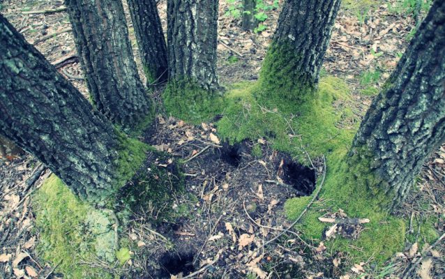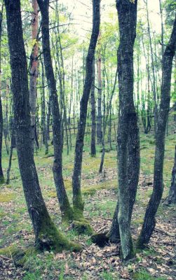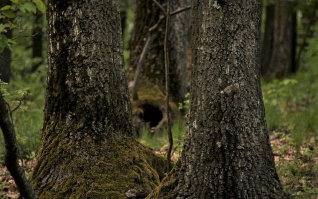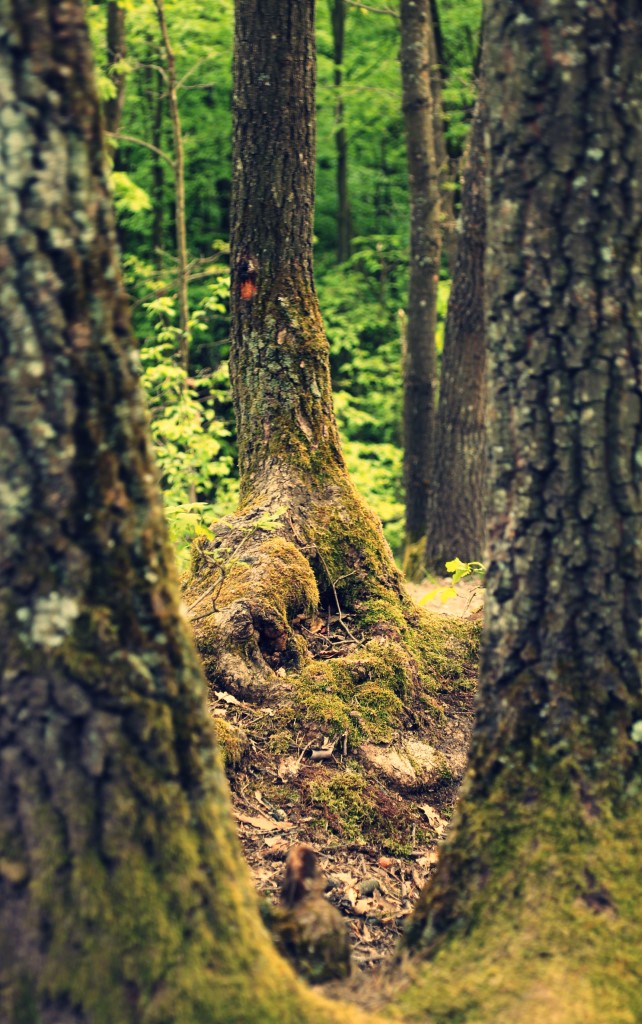 Mai toţi copacii au mai multe trunchiuri care ies dintr-o singură rădăcină unde mai găzduiesc ba o „fântâniţă de spiriduşi”, ba o scorbură întunecată. Alţii îşi unesc bazele şi răsar în lături de parcă ar fi băncuţe sau scaune care te îndeamnă să poposeşti şi să asculţi freamătul potolit al vântului prin frunzele tinere. E cam linişte în pădurea asta. Păsările se aud rareori, iar muşchiul gros şi uscat îţi ascunde paşii.