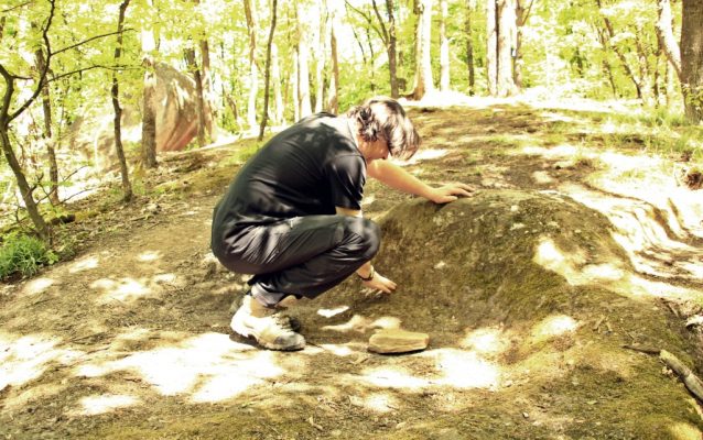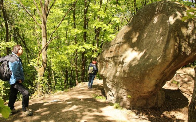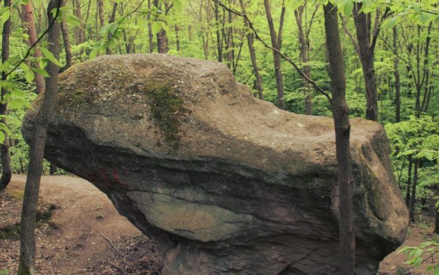 Când ajungi la capătul potecii, zăreşti „Tronul străbunilor”. Parcă ar creşte dintr-o palmă a locului, o palmă cu degete ridicate din stejari. E o piatră masivă, de câţiva metri, care stă pe o talpă, precum un pui uriaş într-un picior. Unul zdravăn de tot.