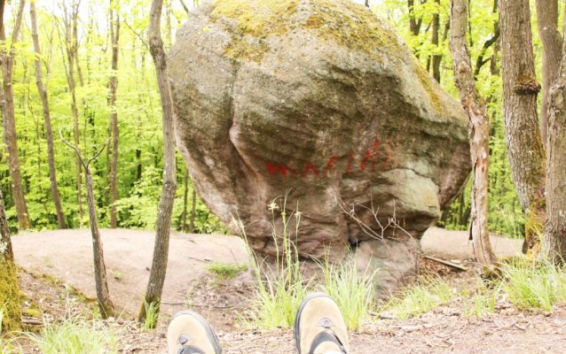 În jurul „Tronului…”, locul e atât de umblat că pare bătucit de-a dreptul. Am ajuns devreme aşa că nimeni altcineva nu mai tulbură locul. După ce am dat ocol bolovanului, e timpul privirii să iscodească. Dungile de pe suprafaţa cenuşie poartă în ele poveşti despre veacurile de eroziune. Câţiva metri mai la vale, o altă stâncă cu formă ciudată atrage atenţia vizitatorilor. E ca un lighean uriaş în care poţi să te întinzi liniştit.