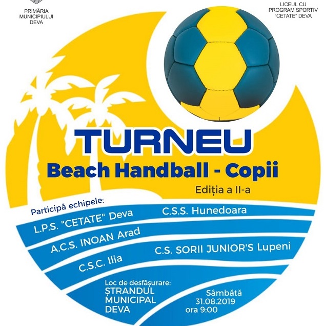Sâmbătă, 31 august 2019, Ştrandul Municipal Deva va fi gazda Turneului de handbal pe nisip ,,Beach Handball – Copii” ediţia a doua. Startul competiţiei se va da la ora 9:00.