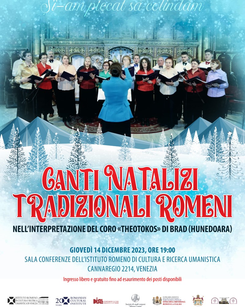 Institutul Român de Cultură și Cercetare Umanistică de la Veneția, în colaborare cu Parohia Ortodoxă „Adormirea Maicii Domnului” din Brad (jud. Hunedoara), Departamentul de Studii Lingvistice si Literare al Universității din Padova și Societatea de studii românești „Miron Costin”, organizează un recital de colinde, joi, 14 decembrie 2023, la ora 19:00, la sediul Institutului, în interpretarea Corului „Theotokos”, coordonat de dirijor Ioana Macsim și de preotul Alexandru Letea.