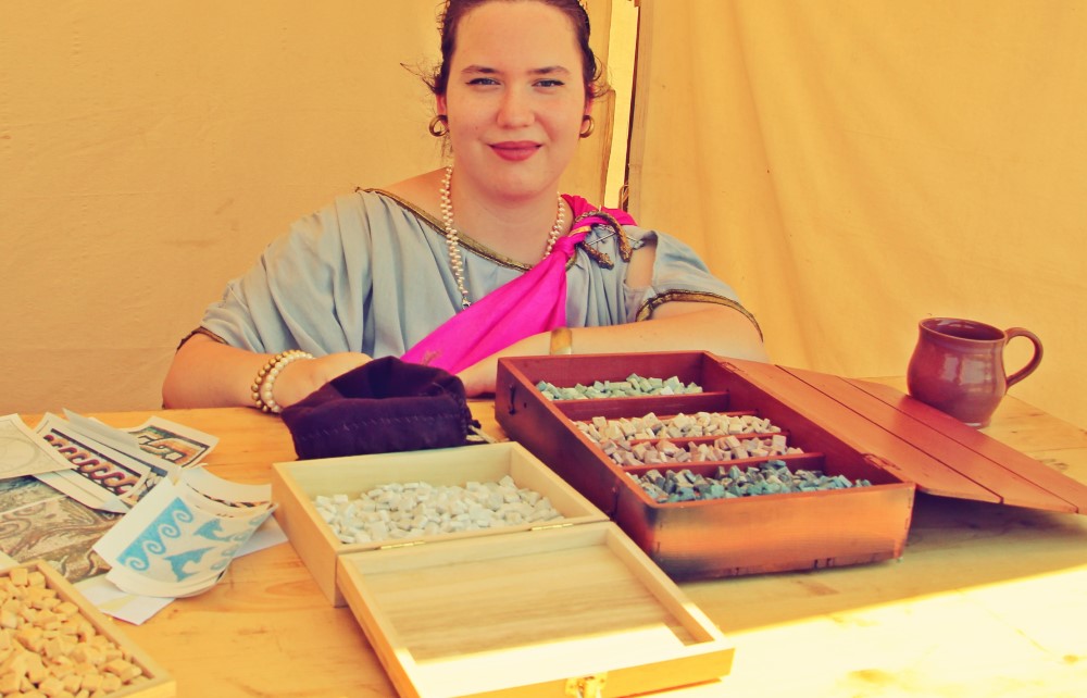 De pildă, puneau nucile pe pământ, în formă de triunghi, şi lăsau să cadă a patra nucă, astfel încât să se facă o pidamidă. Cine câştiga, lua nucile”, spune zâmbind femeia. La atelierul de scris, tăbliţele cu ceară – caietele Antichităţii – îi fascinează pe micii vizitatori, care exersează de zor alfabetul latin.